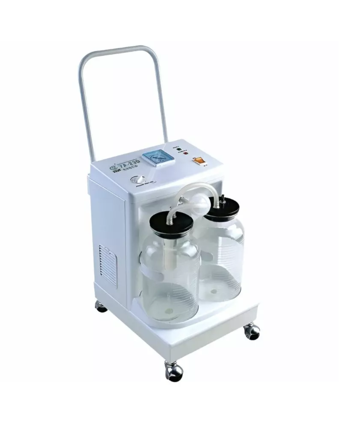 This hospital-grade suction machine features a powder-coated premium steel chassis for durability and hygiene. It operates on AC 220V/50Hz power and delivers a suction flow of ≥20 L/min with a maximum negative pressure of ≥0.09 MPA (680 mmHg). The unit includes two large jars of 2500 mL each, long-pressure tubing, and vacuum control for smooth and precise suctioning.